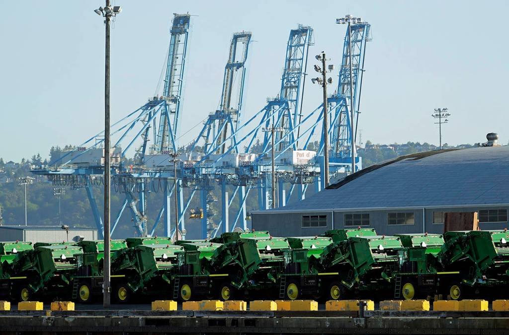John Deere Agricultural machinery made by Deere & Company sits staged for transport Friday, near cranes at the Port of Tacoma. U.S. and Chinese negotiators resumed trade talks Friday under increasing pressure after President Donald Trump raised tariffs on $200 billion in Chinese goods and Beijing promised to retaliate. (AP Photo/Ted S. Warren)