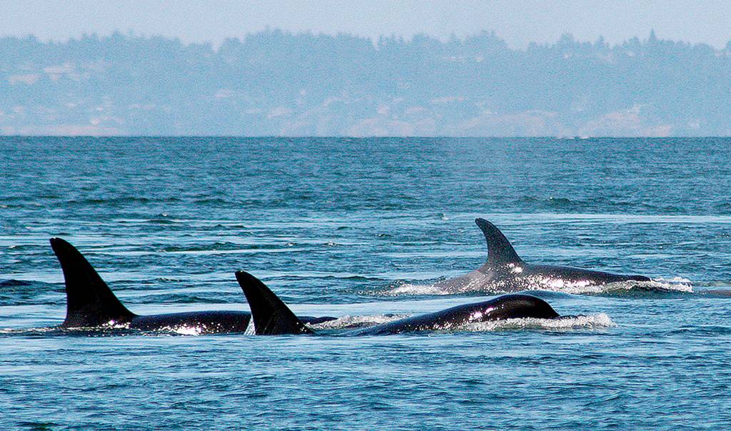 Southern resident killer whales swim off the coast of San Juan Island. (Jane Cogan/University of Washington via AP)