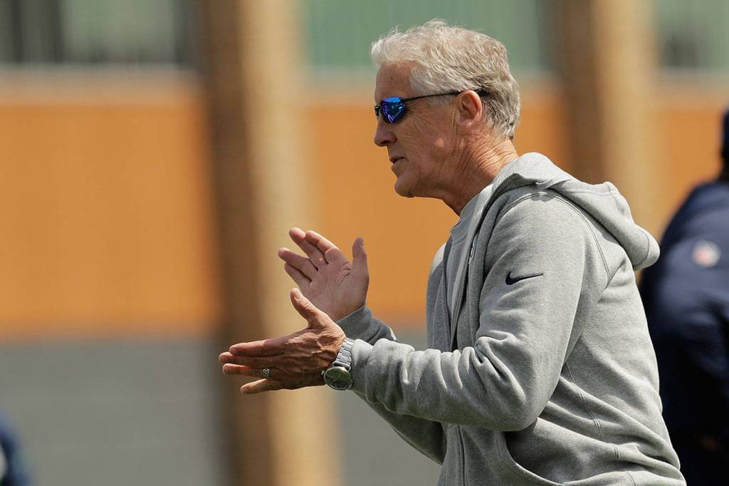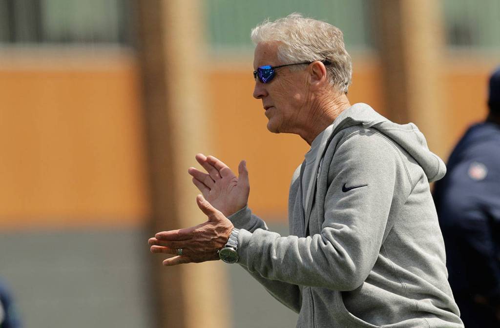 Seahawks head coach Pete Carroll encourages players on the first day of rookie minicamp on May 3, 2019, in Renton. (AP Photo/Ted S. Warren)