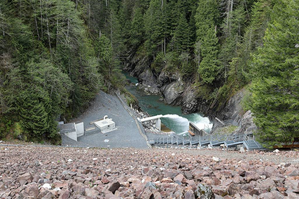 The Culmback Dam sits at the western edge of Spada Lake — a whale-shaped reservoir north of Sultan. From the dam, one pipe drops water 1,100 feet to the Henry M. Jackson Hydroelectric Project about eight miles away, then into the Sultan River. The powerhouse generates enough electricity to power about 35,000 homes.