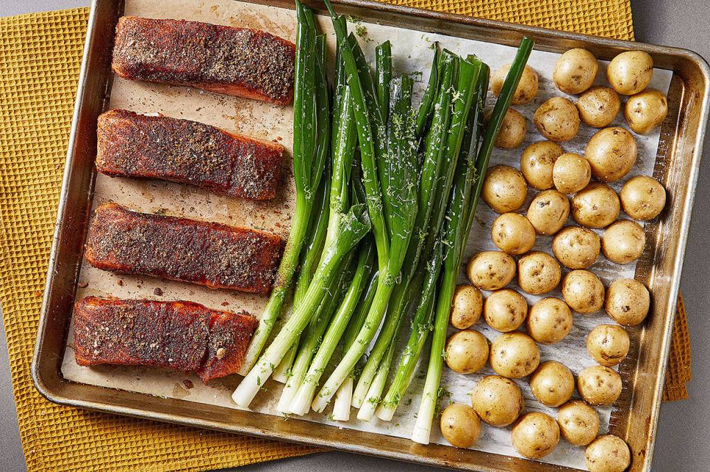 You can also account for foods that cook at different rates by adding them to the sheet pan in stages. That’s what The Washington Post’s Bonnie Benwick does with her Brown Sugar and Chili-Rubbed Salmon Sheet Pan Dinner. She first cooks Yukon Gold potatoes for about 10 minutes and then adds the quicker-cooking scallions and salmon. The result: Everything is finished at the same time.