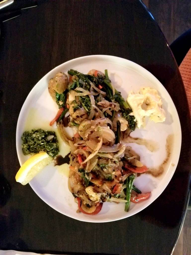 My mom ordered the Basque-style cod fillet baked over a saute of broccolini, red peppers, onions, baby red potatoes, shrimp with chicken stock, brandy, wine and butter. It came with chimichurri sauce and bacon aioli on the side for dipping. The cod was cooked through, and yet was so moist that it fell apart in our mouths.