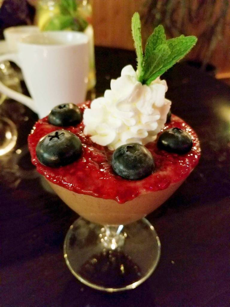 For dessert, I ordered the vanilla creme brulee paired with berries Romanoff. My mom had the chocolate mousse, layered with orange whip and berry coulis, and garnished with fresh berries and mint. Both were decadent.