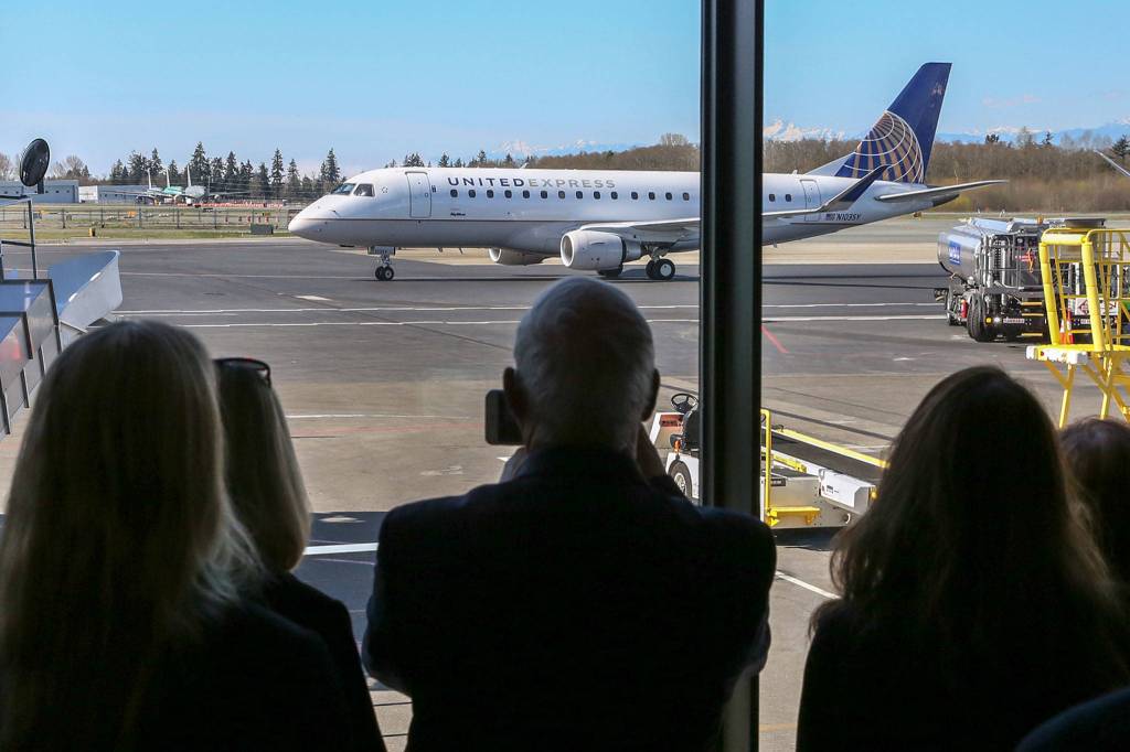 The first flight for United Airlines at Paine Field taxis to the gate on March 31. (Kevin Clark / The Herald)