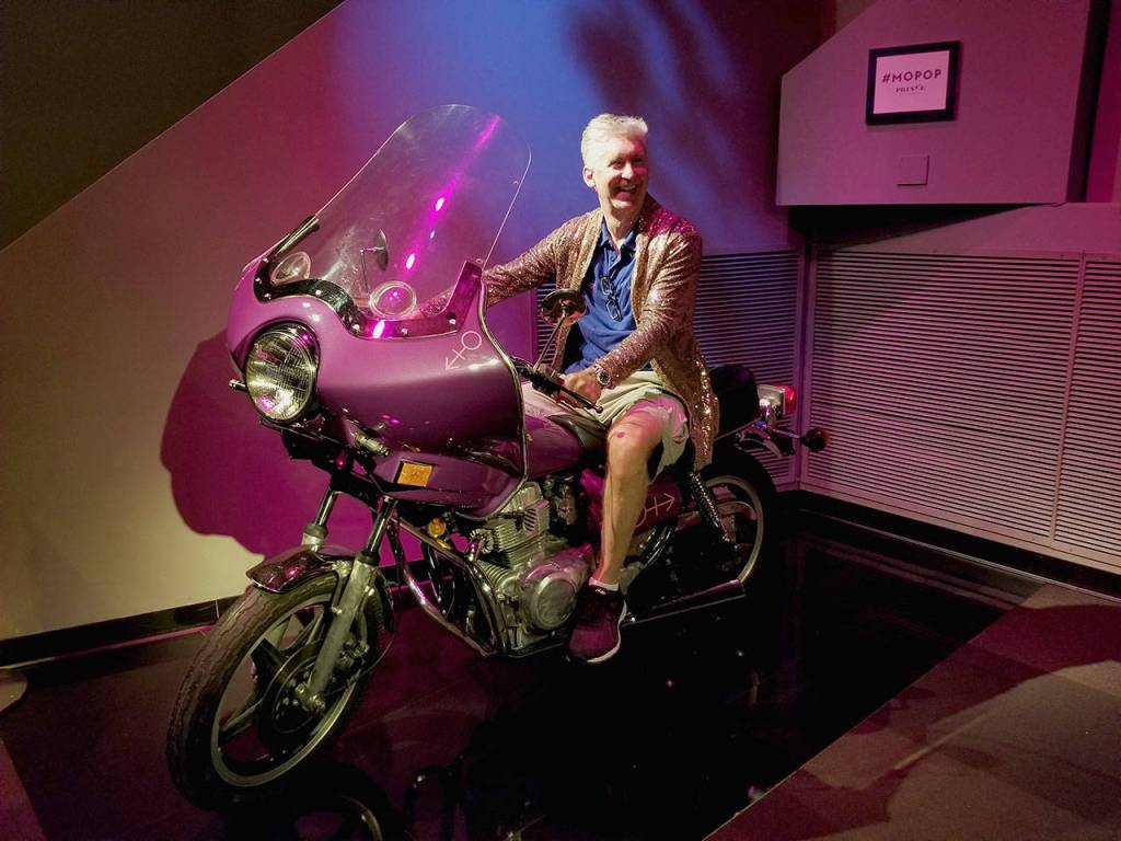 I recently visited “Prince From Minneapolis,” the Museum of Pop Culture’s exhibit on the musician’s image and impact on other artists. It includes a replica of the 1981 Hondamatic motorcycle Prince rides in “Purple Rain.” I couldn’t pass up the opportunity to sit astride the purple bike; fortunately, it’s bolted to the floor.