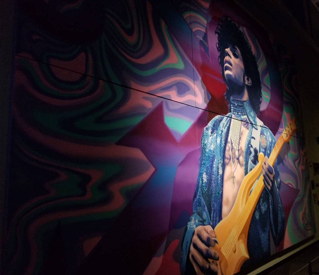 In the exhibit, just past the tornado of guitars and nestled behind the tribute to Jimi Hendrix, from whom Prince drew inspiration, you’ll find 50 artifacts, 25 photographs, 15 Prince-inspired artworks, one of his distinctive guitars and two outfits from “Purple Rain.”