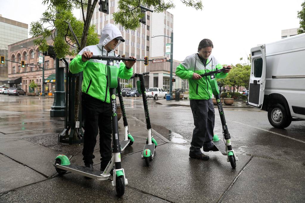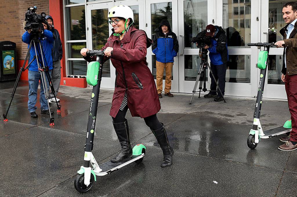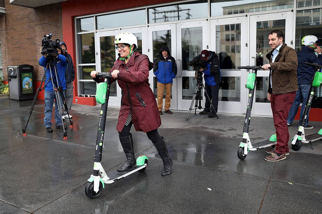 Lime held a kick-off event downtown Friday morning. The constant rain didn’t deter Everett Mayor Cassie Franklin from taking her first ride. She and her deputy mayor, Nick Harper, pushed off along Wetmore Avenue as television cameras tracked their moves.