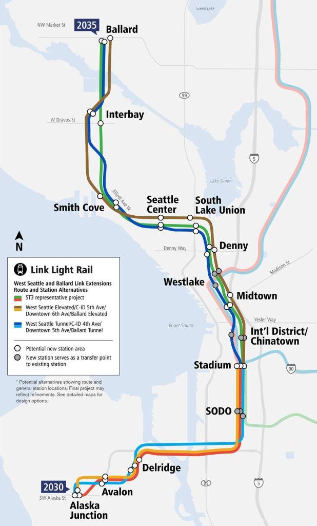 The tunnels were not part of the $54 billion ST3 package voters approved in 2016, which also will connect the light-rail system to Everett and Tacoma. The plan included an elevated route into West Seattle’s Alaska Junction and a movable bridge over Salmon Bay to Ballard.