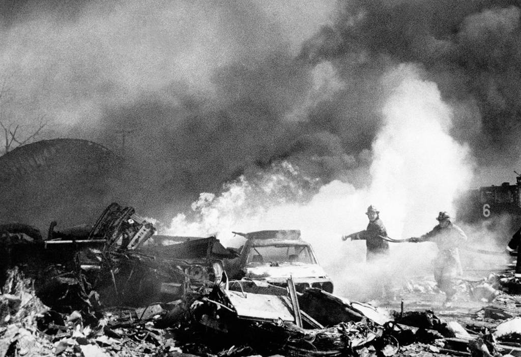 Firefighters from Elk Grove Village, which borders O’Hare, were on the scene in four minutes. They’d been told a plane had crashed. But the smoke was so thick that Bill Clark, a lieutenant at the time, said he couldn’t be certain until he sliced through a fence and saw the deep furrow the aircraft made in the ground, along with debris and victims.