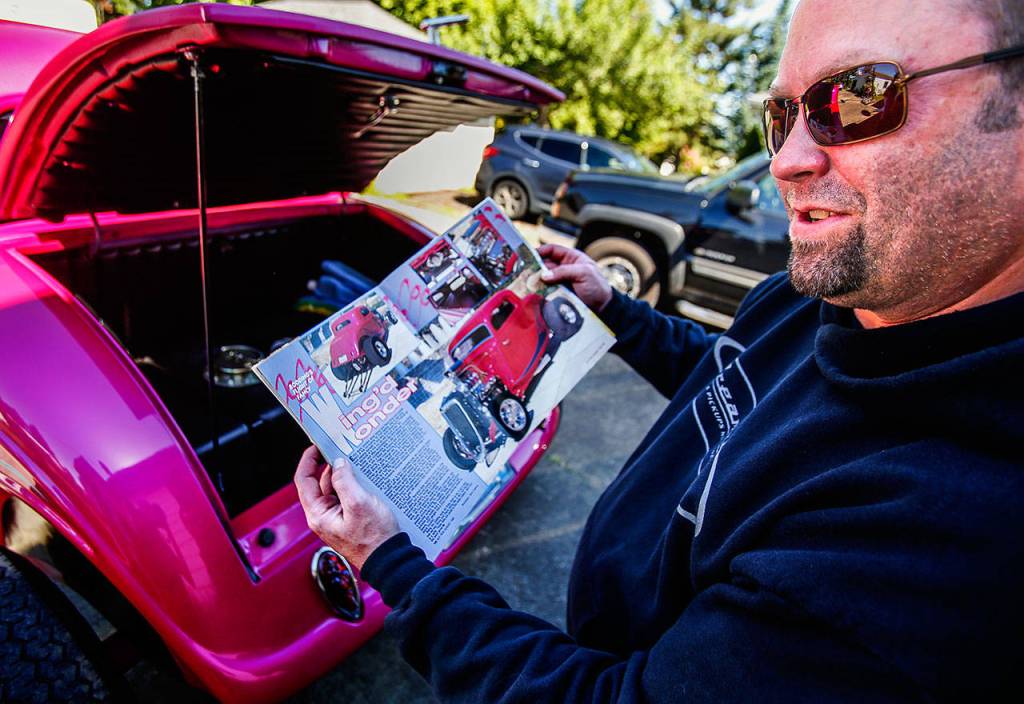 Along with that Hot Rod magazine, Rimstad has another memento — he had it way before getting the car. An image of the pink hot rod is on a T-shirt from a long-ago Seattle Rod-Tiques “Blast from the Past” car show. Rimstad said he found the shirt stored in his attic.