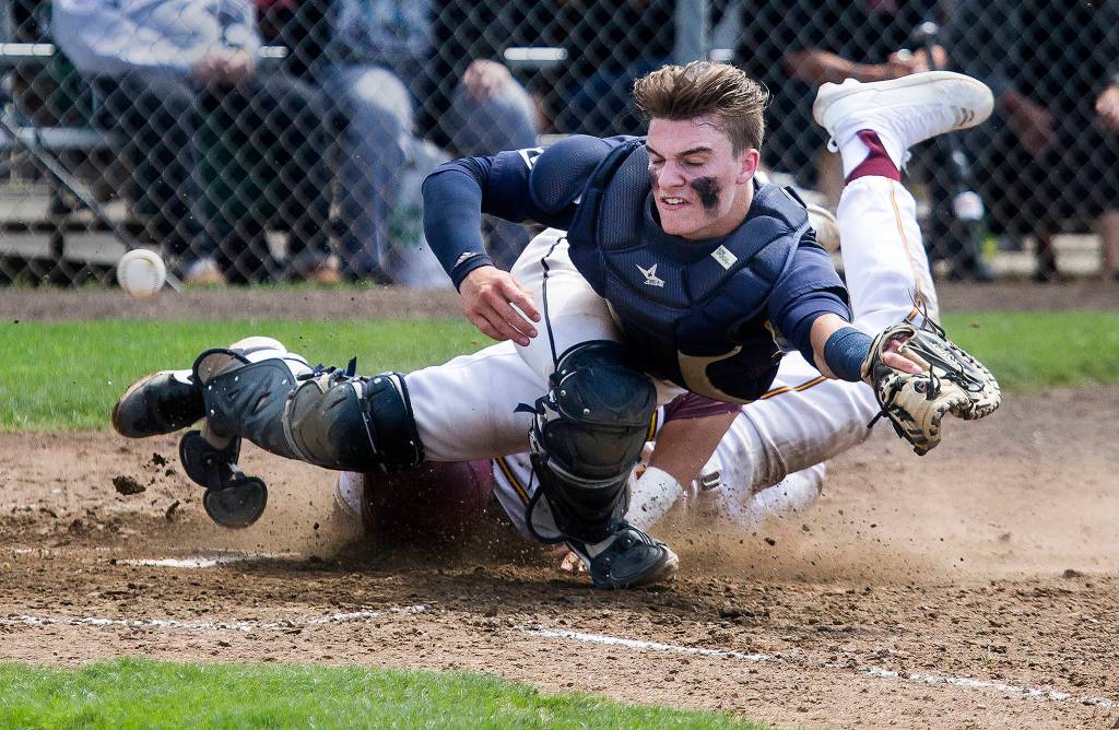 Arlington’s Jack Sheward is hit in the leg as O’Dea’s David Sessoms slides in for the tying run as Arlington lost 7-6 to O’Dea in a 3A baseball state regional game at Sherman Anderson Field on May 18 in Mount Vernon. (Andy Bronson / The Herald)