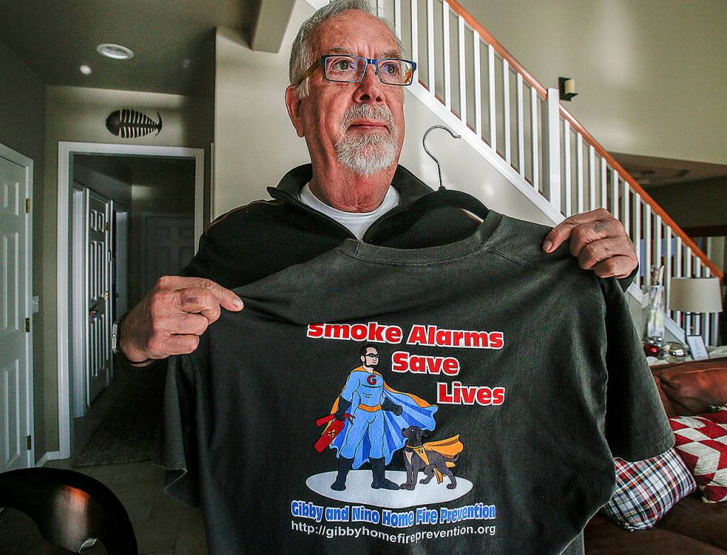 The couple presented the governor and First Lady Trudi Inslee with T-shirts emblazoned with “Smoke Alarms Save Lives,” the motto of the Gibsons’ nonprofit which installs smoke alarms for free. The shirts also have images of their son and his dog, Nino, as the heroes.