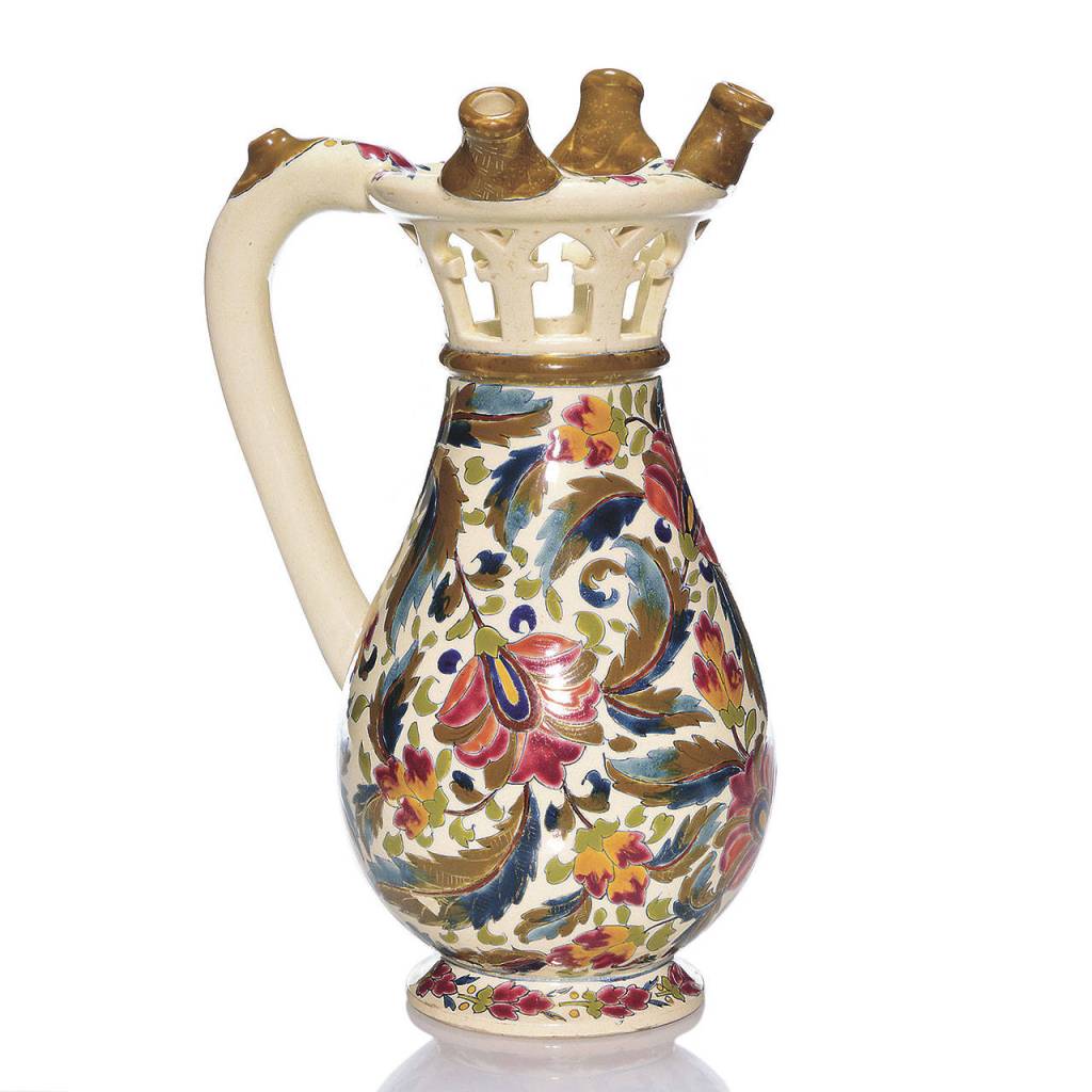 Just how old is this traditional puzzle jug marked “Fischer J Budapest”? In Hungarian, surnames are written first, and I and J are the same. The Fischer J in the mark stands for Ignac Fischer, a distant relative of Moritz, who trained with his father and later with Moritz.