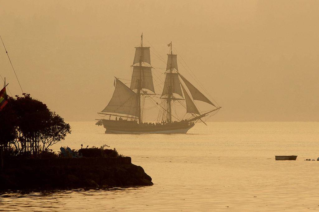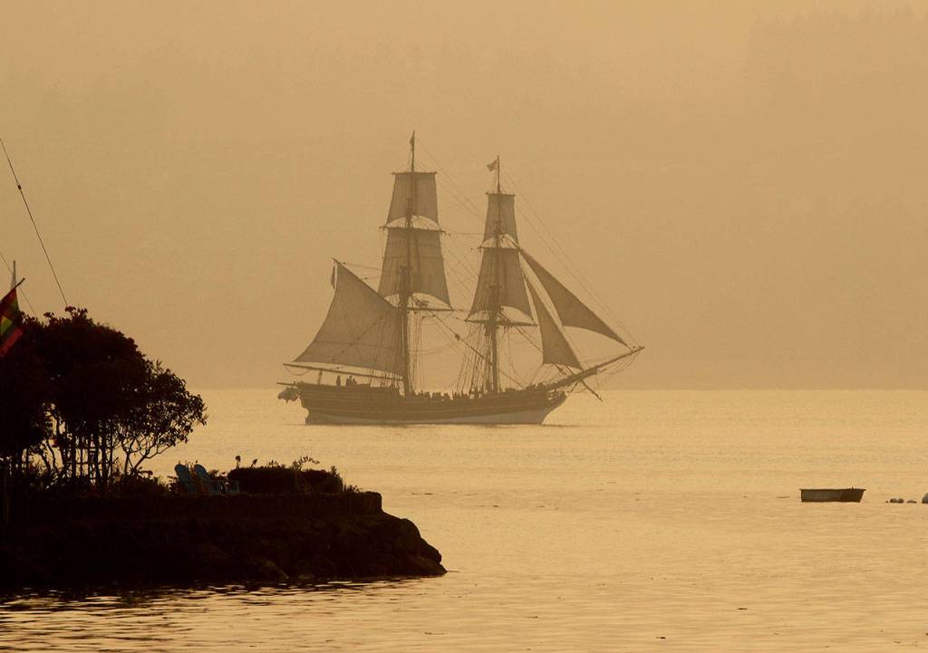 The tall ship Lady Washington sails off Port Orchard, in August 2018, through the smoky haze at sunset. The smoke was from the many wildfires in the Pacific Northwest and Canada. (Larry Steagall/Associated Press file photo)
