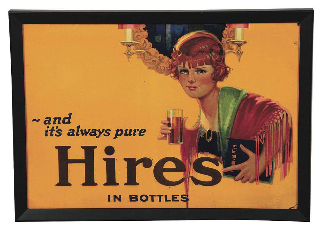 Hires Root Beer was a leading drink, but the company has been bought and sold so often, the drink is now almost out of production. Old Hires advertising is hard to find today, but beware of the pottery mug with a baby wearing a bib. Reproductions are easy to find.