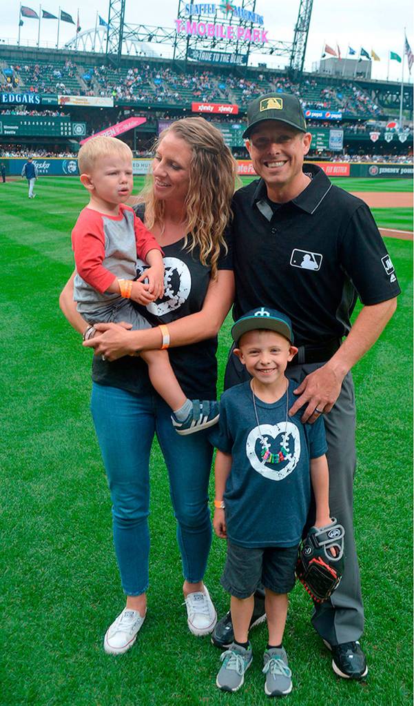 It was one of the rare times during the season that he got to see his family. They and friends visited with him in the ump’s locker room before the game. As part of charity work he does with UmpsCare he met with two teen-age boys who are hoping to be adopted. With his ever-present smile, Gibson gave them bags of goodies, along with the thrill of going out on the field at T-Mobile Park.
