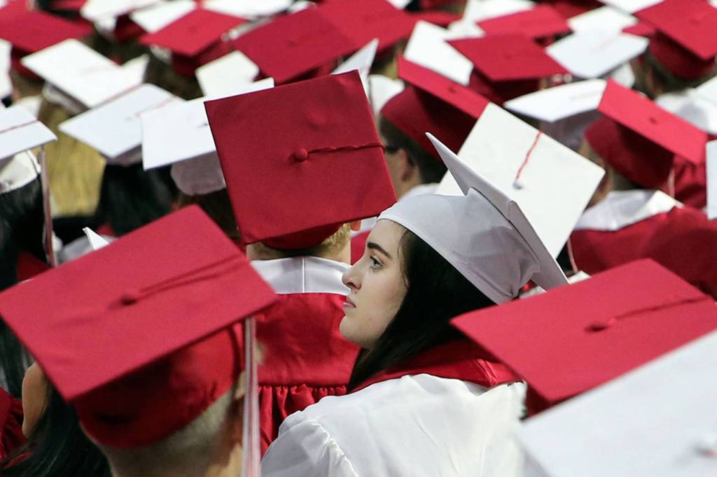Students wave during the graduation of Marysville Pilchuck High School’s Class of 2019 at Angel of the Winds Arena in Everett on June 12. (Kevin Clark / The Herald)