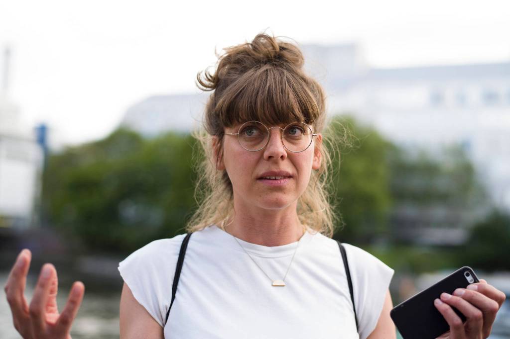 In Berlin, Fiesinger checks her phone for food offered in her neighborhood.