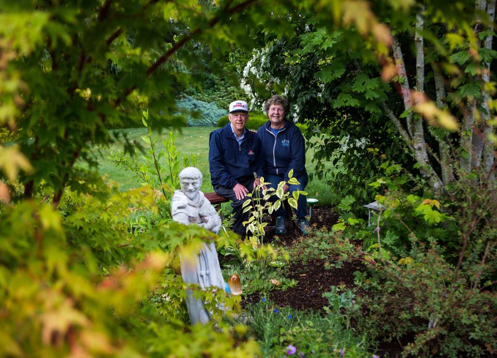 Kathy Hope’s favorite garden plants are the purple, pink, yellow and red rhododendrons. Their property has trees so large Dave Hope calls the Alaskan weeping cedars “The Lord of the Rings” trees.