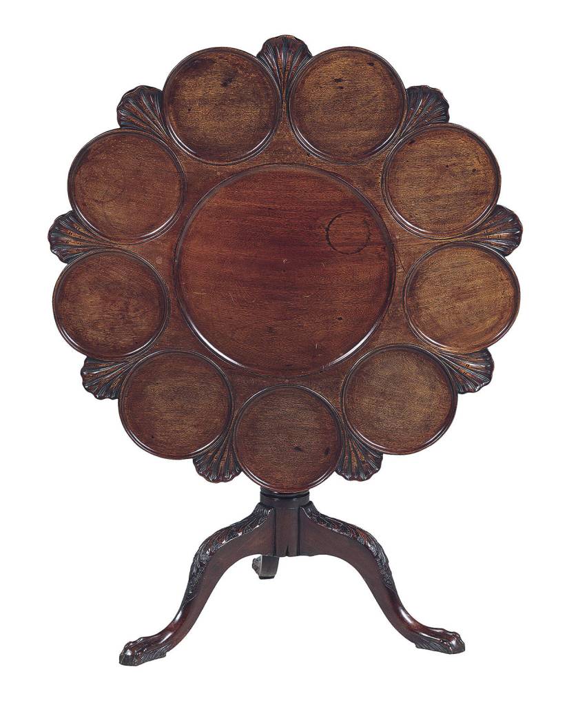 A 19th-century George III-style table with recessed sections was auctioned recently at New Orleans Auction Gallery. It was 3 feet in diameter and had nine recessed circles. Listed as a tripod table (three-part leg) with a floriform top, it was estimated at $1,200 to $1,800.