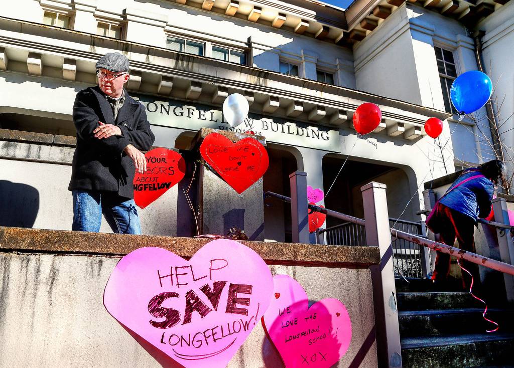 People involved in local historical efforts have put their hearts into seeing the building spared. On March 1, history lovers and former Longfellow students showed up at the old school at 3715 Oakes Ave. to stage what preservationists call a “heart-bombing.” They taped big paper valentines — decorated with “Help Save Longfellow” and other slogans — to the outside of the three-story white edifice.