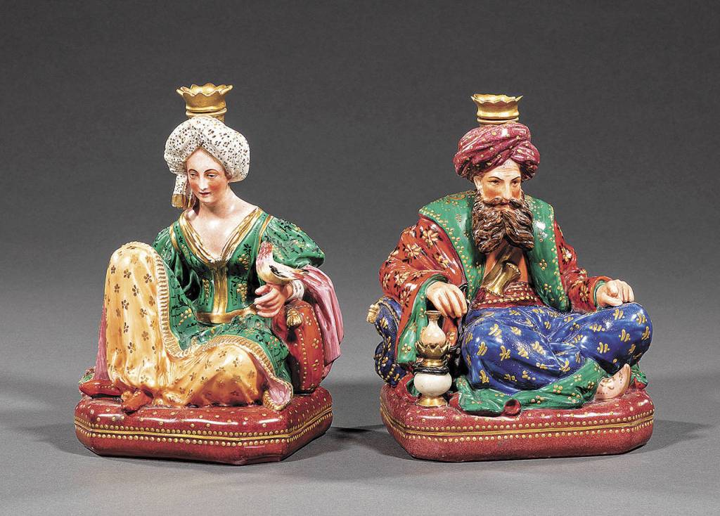 But today Jacob Petit perfume bottles are favorites of perfume bottle collectors, and there seem to be a few in every perfume bottle auction. Many are unmarked. The best-known mark is the underglaze letters “JP” in blue or incised. Other marks are “JP” with a dot below and above the J and a dot below the P. There is also a diamond-shaped mark with the letter J outside the left corner and the letter P outside the right. Beware, they are best known for making copies of Chinese Export, Sevres and Meissen pieces that have fooled many collectors. A pair of authentic 7½-inch-high figures of a Sultan and Sultana in elaborate clothing sold at a spring 2019 Neal Auction in New Orleans for $1,220.