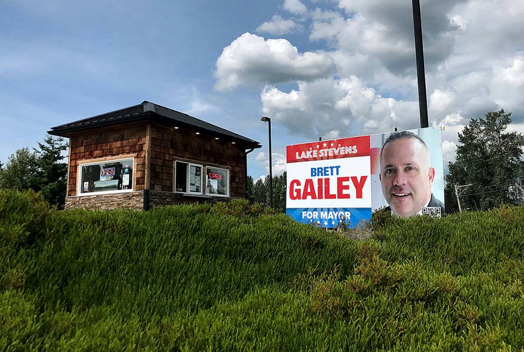 A campaign sign for Lake Stevens mayoral candidate Brett Gailey is on display at the intersection of 20th Street NE and Main Street. (Stephanie Davey / The Herald)