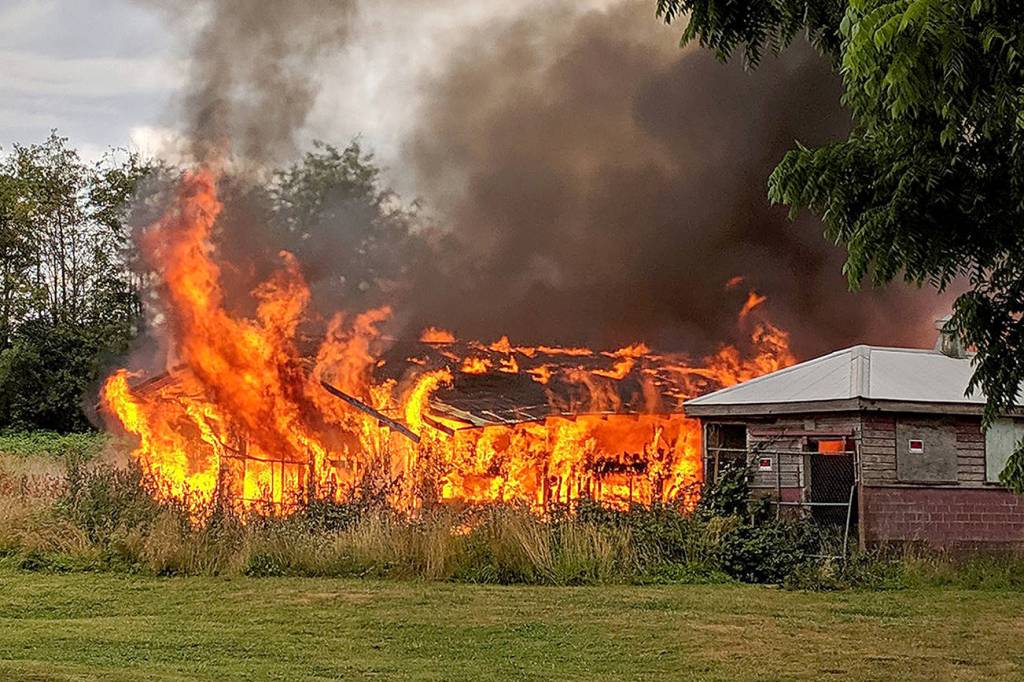 Firefighters were dispatched around 7:30 a.m. to the scene near the intersection of highways 9 and 530. Smoke spewed from the barn and nearby buildings as crews from the Arlington Fire Department and other nearby agencies worked to extinguish the flames.