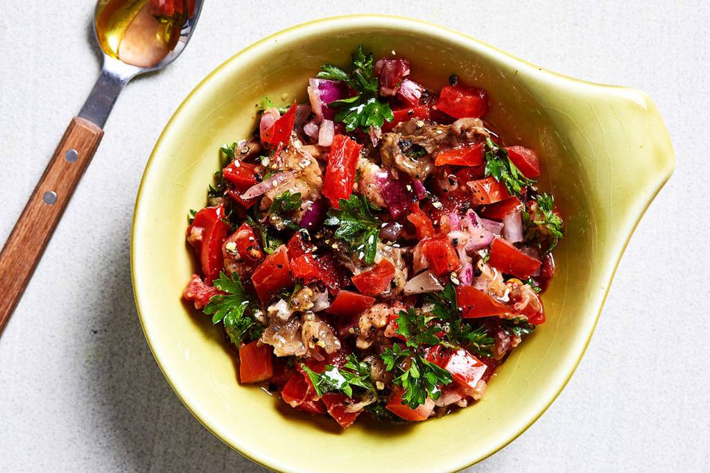 Discard the eggplant stems and use your fingers (or a paring knife) to peel off and discard the skin. (It’s OK if some bits of charred skin remain.) Coarsely chop the eggplant (it will be soft; the pieces won’t be clearly defined) and place it into a medium mixing bowl. Add the tomato, peppers, parsley, onion, lemon juice, oil, pepper and the garlic paste, stirring gently to incorporate. Taste, add more salt, pepper and/or lemon juice, as needed.