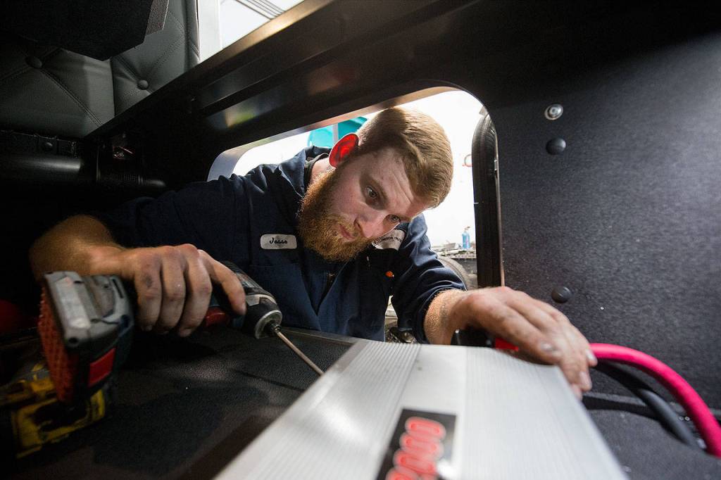 U.S. Marine veteran Jesse Gates installs a power inverter at Motor Trucks, an Everett business that sells and repairs heavy duty trucks. (Andy Bronson / The Herald)