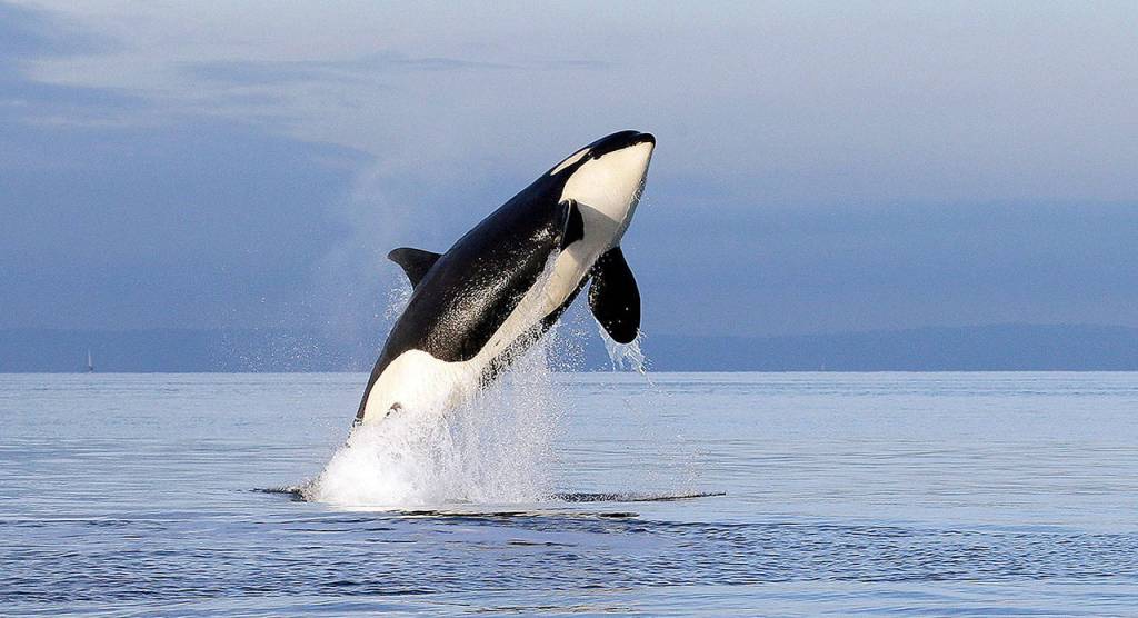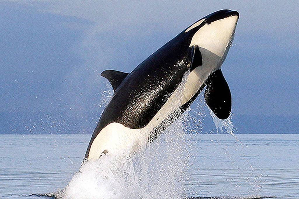A Southern Resident female orca leaps from the water while breaching in Puget Sound, west of Seattle. (AP Photo/Elaine Thompson, File)