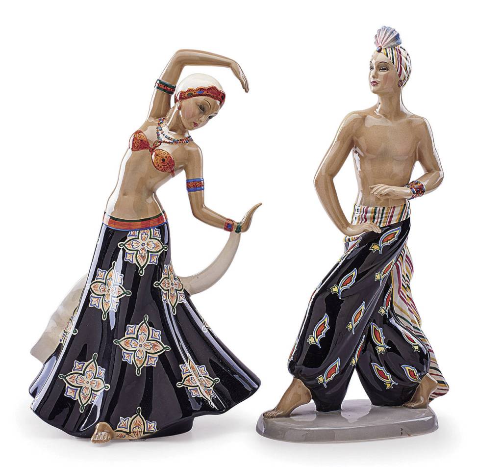 Pairs of ceramic dancing figures in exotic costumes were favorites in the Art Deco period, starting about 1920.