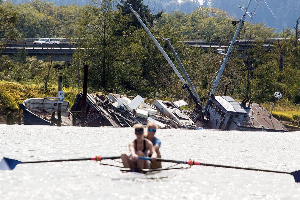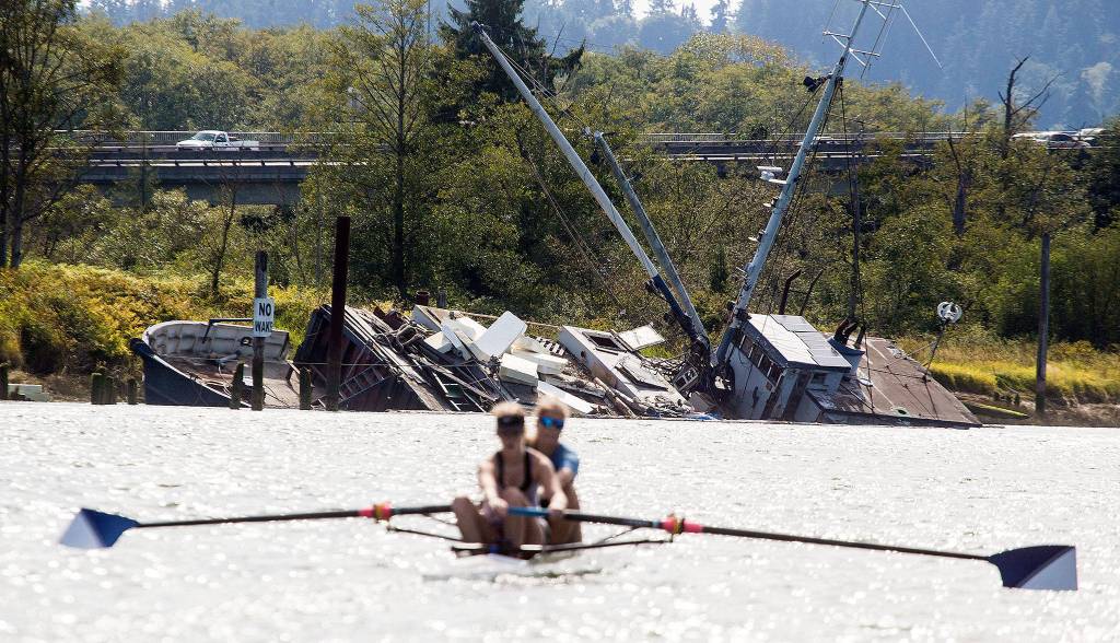 EVERETT — Drivers traveling west on the U.S. 2 trestle can look north and see a sunken 100-foot fishing boat in the Snohomish River. It’s nearly tipped on its side with equipment falling into the river, and the owner just abandoned ship.