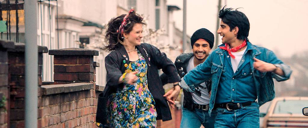From left, Nell Williams, Aaron Phagura and Viveik Kalra exult on the streets of 1980s London in “Blinded by the Light.” (Warner Bros. Pictures)
