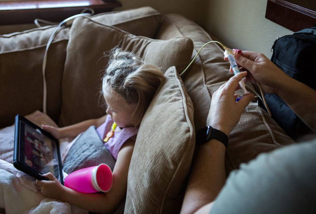 At home, Sadie must eat and take medicine with a feeding tube. She also suffers from posterior fossa syndrome, which causes neurological symptoms such as speech problems that can last for weeks, months or even years following surgery.