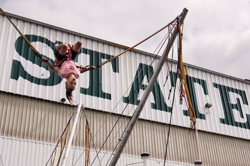 Molly Hiller, 9, performs a back flip on the Power Jump during the opening day of the Evergreen State Fair on Thursday, Aug. 22, 2019 in Monroe, Wash. (Andy Bronson / The Herald)