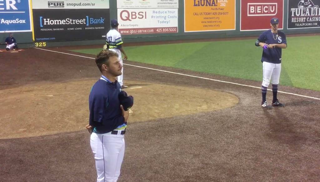 During Friday’s Northwest League game between the Eugene Emeralds and the Everett AquaSox at Funko Field — with a potential no-hitter unfolding on the field — Everett pitcher Travis Kuhn participated in a national-anthem standoff with Emeralds pitcher Ryan Jensen.