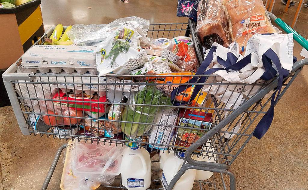 When I finished shopping, my cart had four gallons of milk, three dozen eggs, dinner rolls, English muffins, tortillas, lentils, rice, couscous, spaghetti, oatmeal, cereal, corn meal, 5 pounds of chicken, pork chops, ground beef, round steak, two pounds of fish, five bags of frozen vegetables, frozen juice concentrate, 20 bananas, potatoes and lots of fresh vegetables.