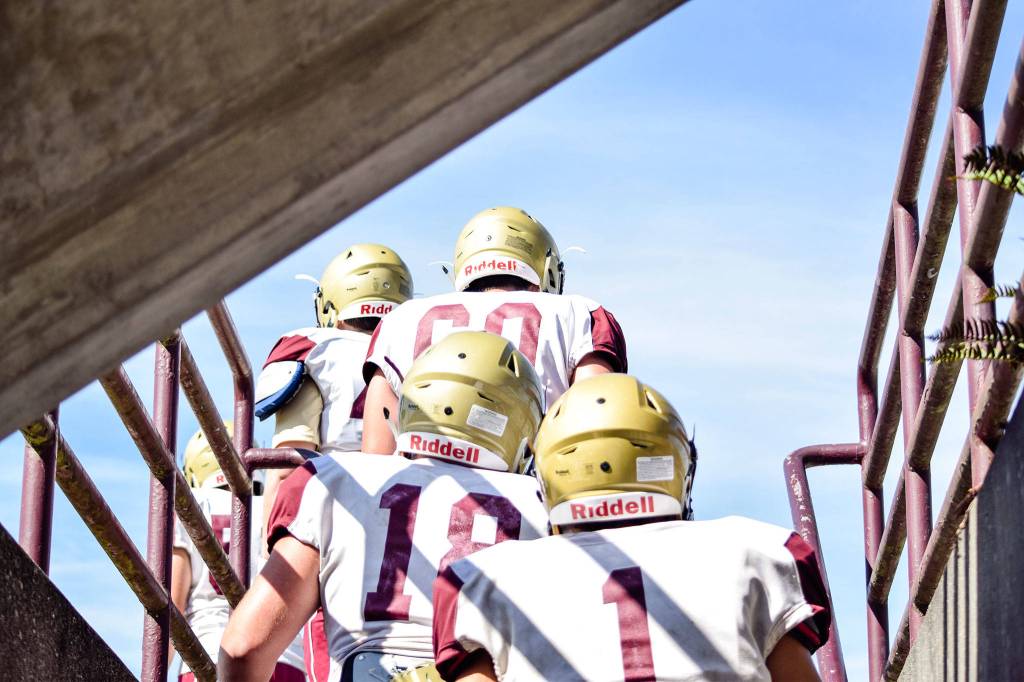The Lakewood football team walks up the stairs towards the field before practice on Aug. 28, 2019, at Lakewood High School in Arlington. (Katie Webber / The Herald)