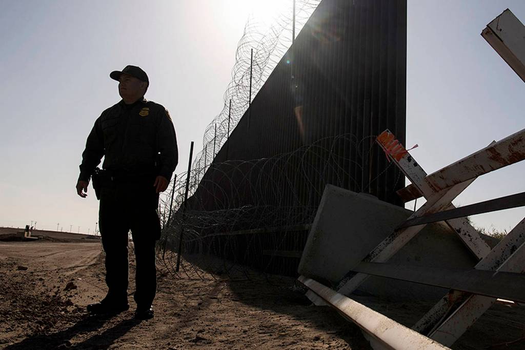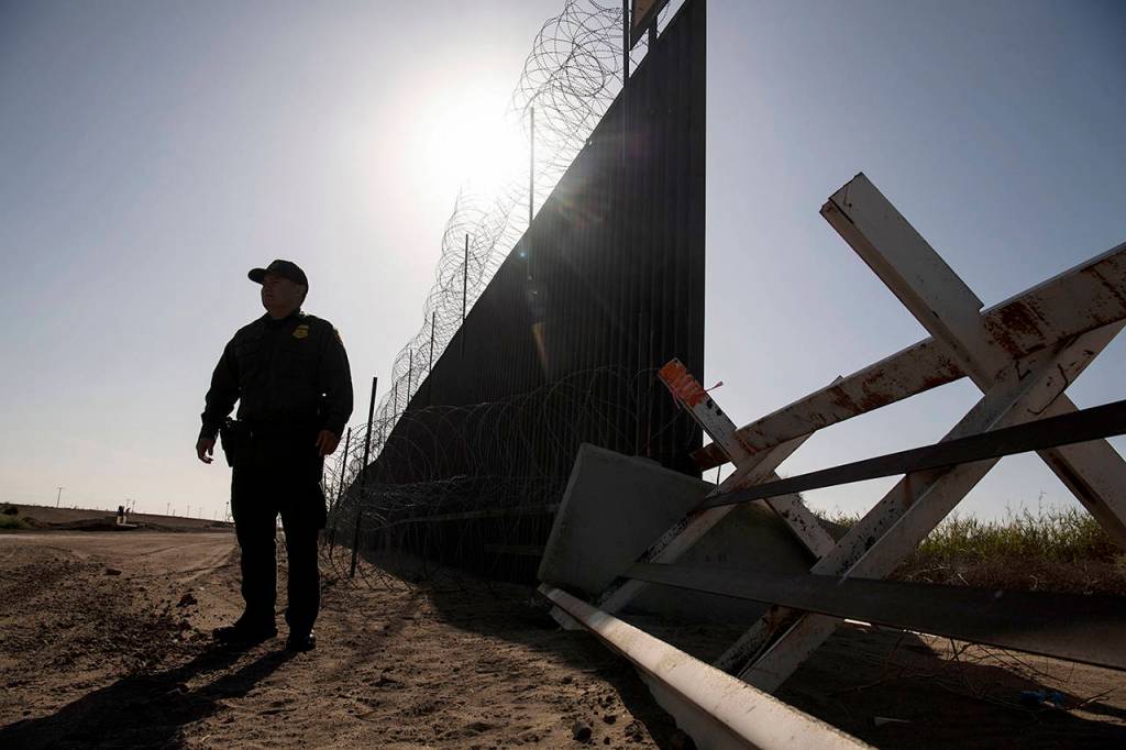 A U.S. Border Patrol agent stands Aug. 23 in Calexico, California, next to a stretch of fence on the U.S.-Mexico border that is to be replaced. (Carolyn Van Houten/Washington Post)