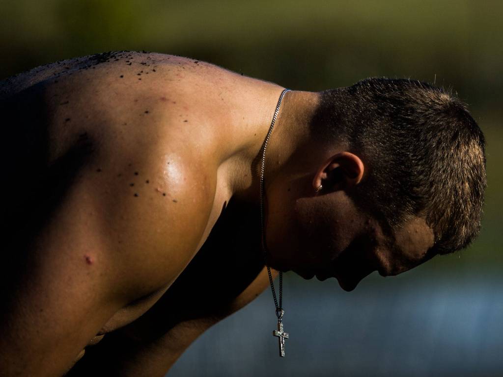 Gavin Monroe’s cross hangs as he stretches on the sidelines during football practice at Monroe High School on Wednesday, Aug. 28, 2019 in Monroe, Wash. (Olivia Vanni / The Herald)