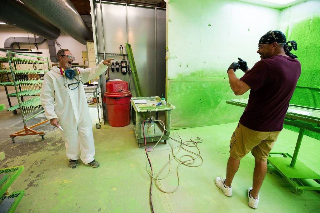 In the painting booths, metal aerospace parts get a precise layer of green paint to help prevent corrosion.