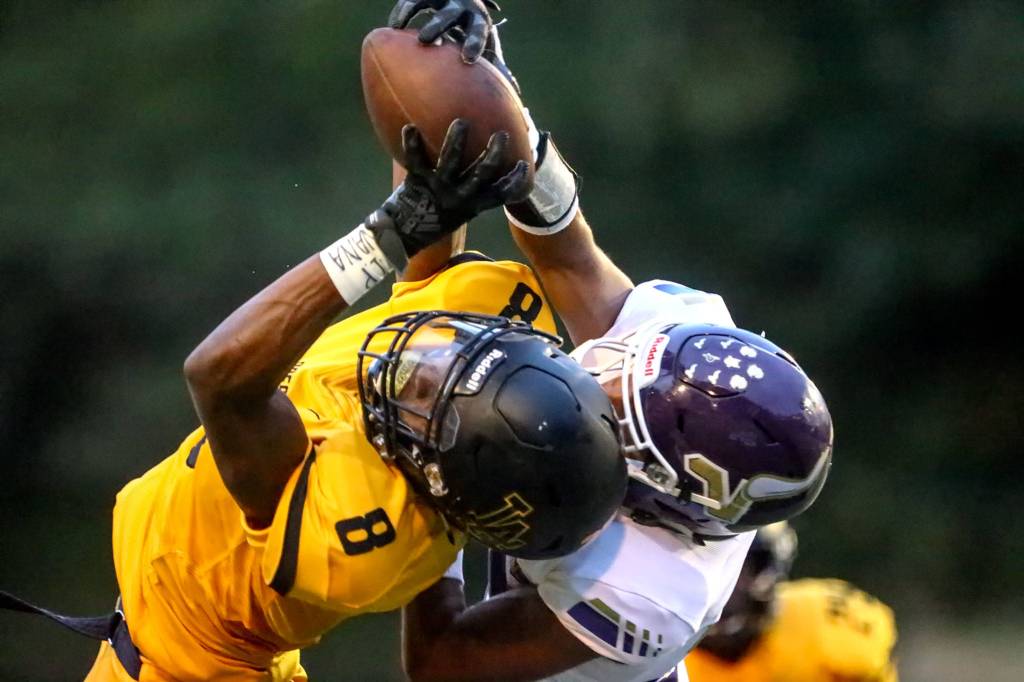 Lake Stevens’ Kasen Kinchen makes a reception over Lincoln’s Jaylen Clark Friday night at Lincoln Bowl in Tacoma on September 13, 2019. Lake Stevens won 35-26. (Kevin Clark / The Herald)