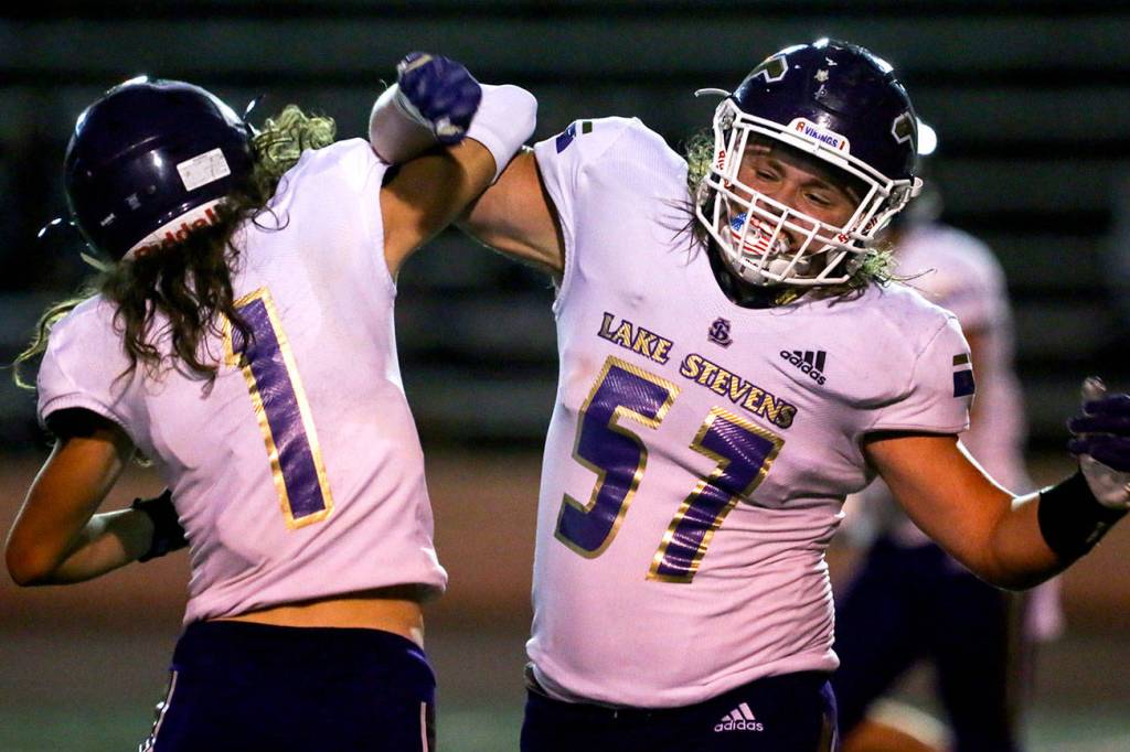 Lake Stevens’ Gabe Ramsey (left) and Austyn Rembold-Hyde celebrate Friday night at Lincoln Bowl in Tacoma on September 13, 2019. Lake Stevens won 35-26. (Kevin Clark / The Herald)