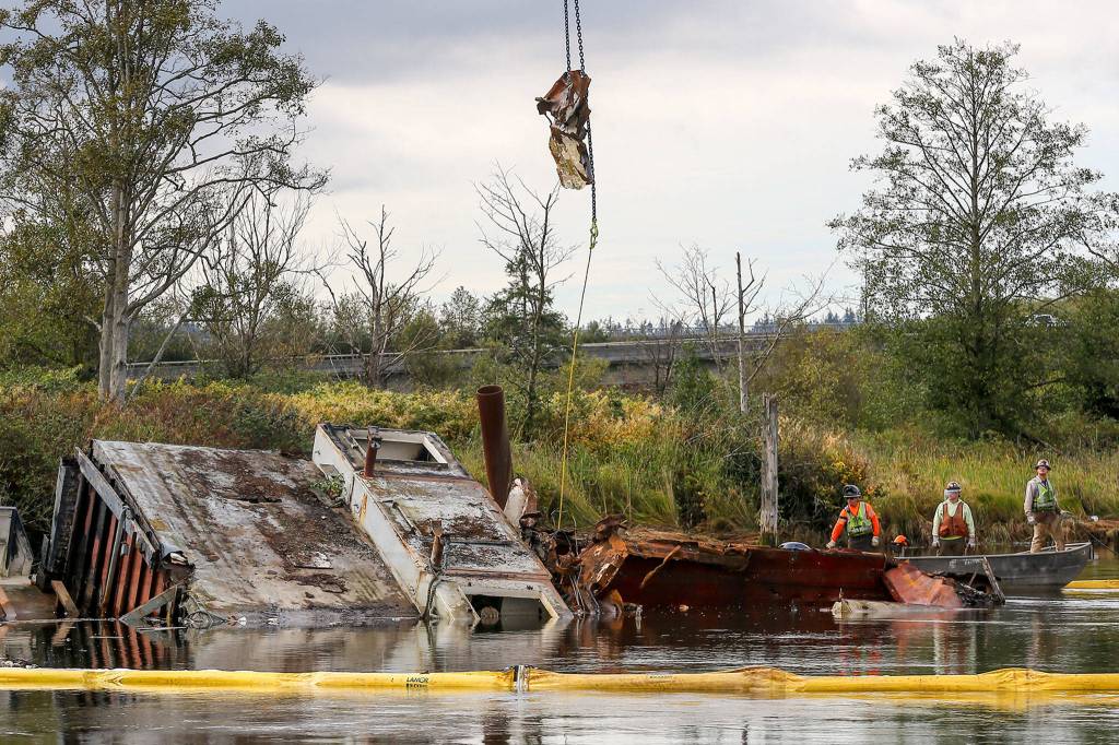 EVERETT — A large crane lifted scraps of wood and metal from the Snohomish River on Thursday, as cars passed overhead on the U.S. 2 trestle.