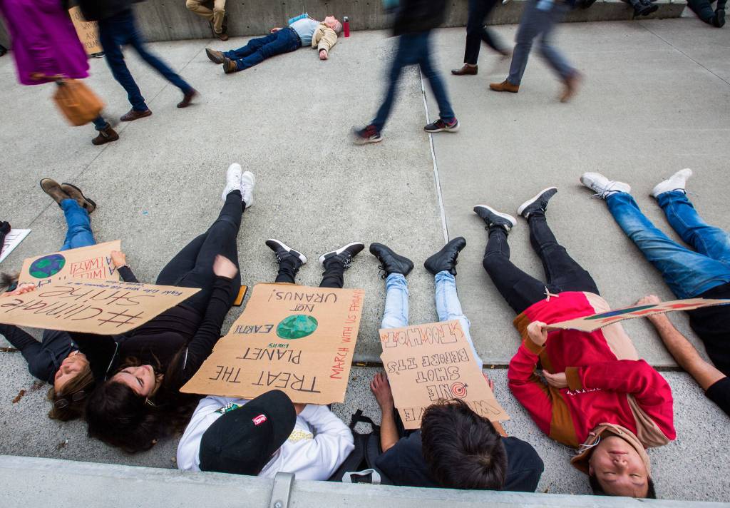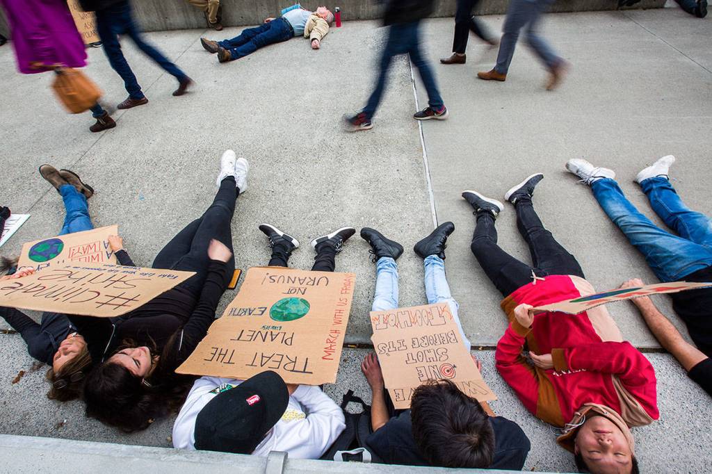 Environmental organization 350 Everett organized the “die-in” in support of the thousands of young people who gathered in Seattle and worldwide Friday to demand action against climate change.