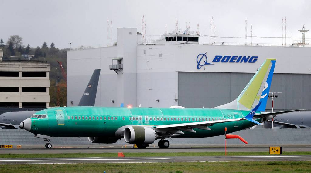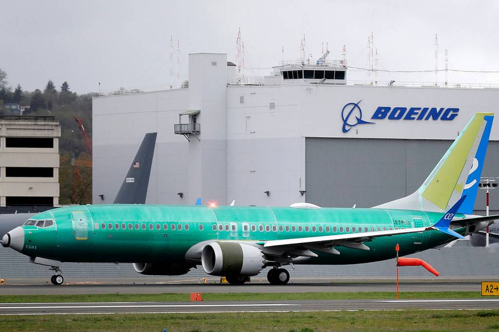 In this April 10 photo, a Boeing 737 MAX 8 airplane being built for Spain-based Air Europa rolls toward takeoff before a test flight at Boeing Field in Seattle. (AP Photo/Ted S. Warren, File)