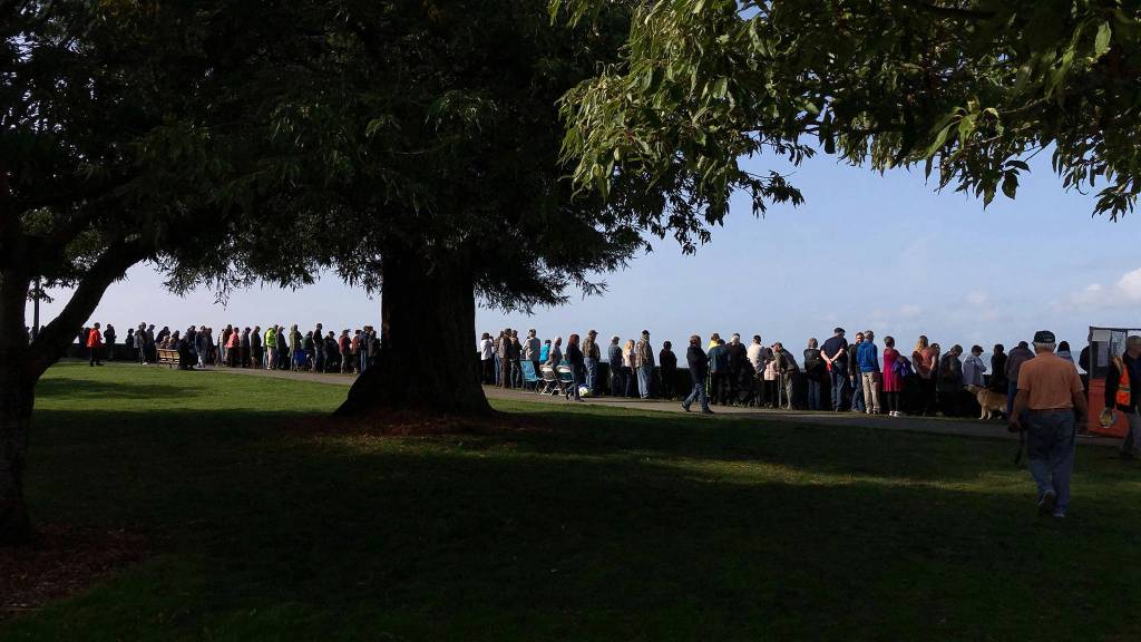 The crowd grows bigger and bigger at the Grand Ave. Park on Wednesday morning. (Andy Bronson / The Herald)
