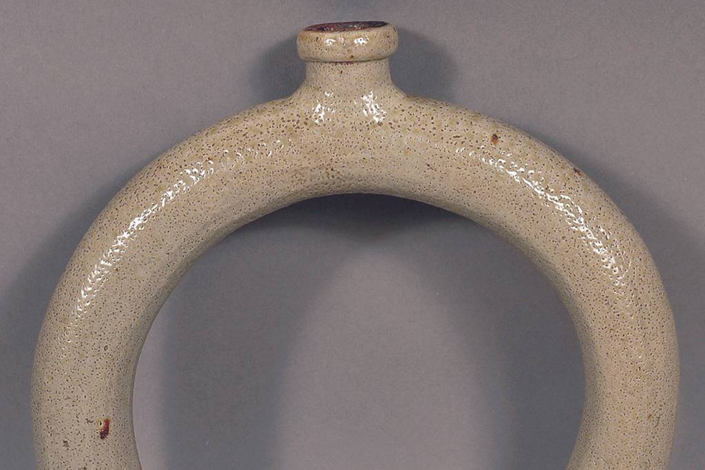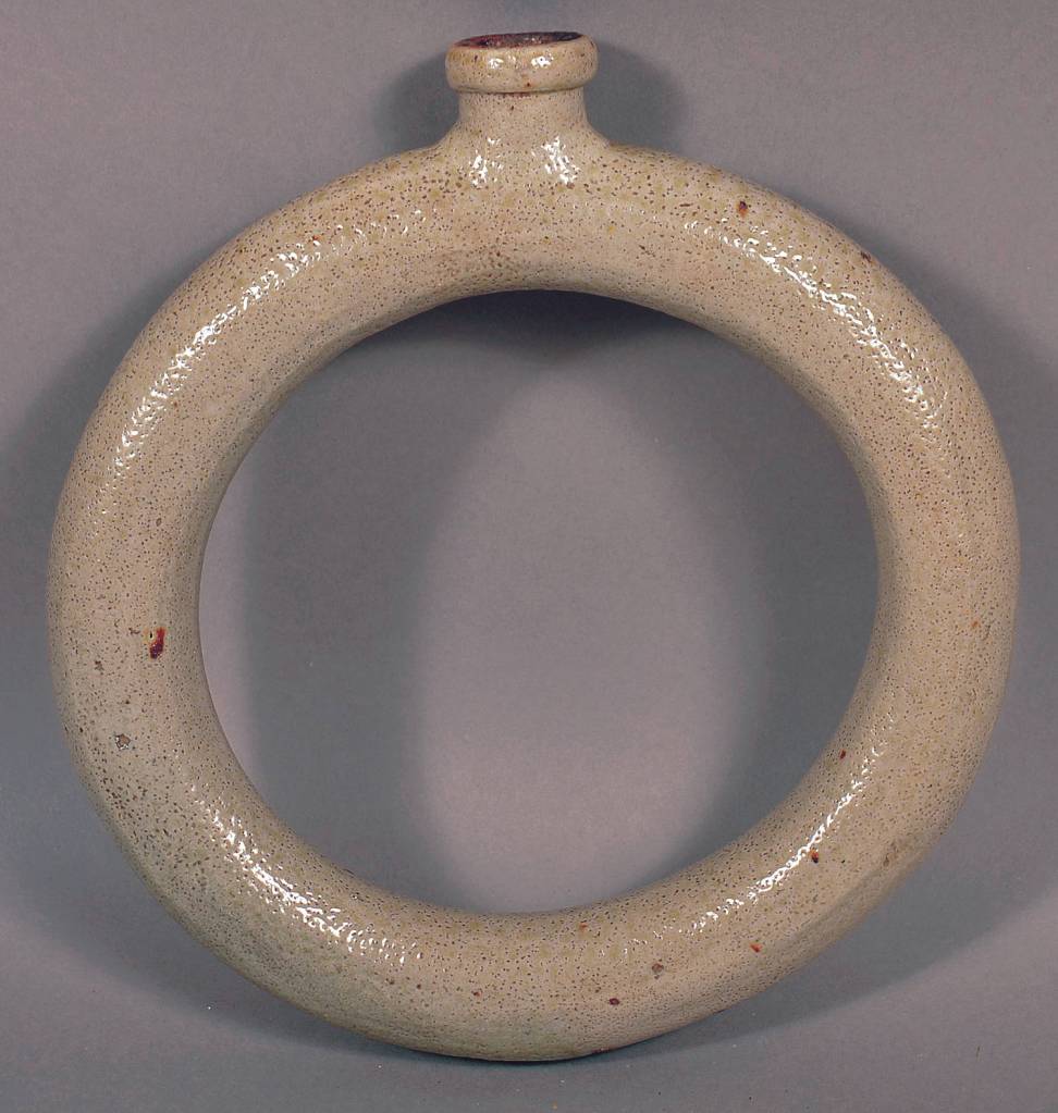 The pottery was shaped like a tube bent into a circle with an opening at the top. It is a 19th-century stoneware ring flask. Farmers worked in the fields all day and they could carry water in the flask. It was worn on the shoulder, so water was always available. This flask was glazed to look like it is made of pottery, but many examples were more elaborate with incised colored decorations, faces or other slightly raised decoration.