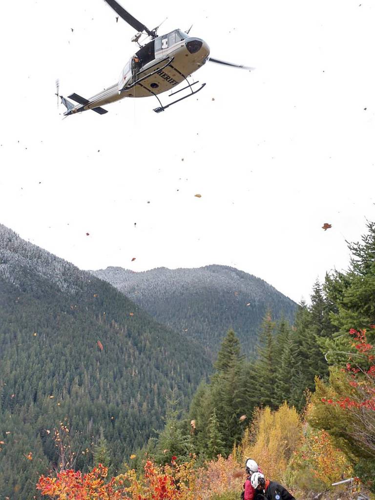 Another man, 76, of Chelan, called for help with his locator beacon around 11:20 a.m. Sunday. Quickly, the SnoHawk 10 crew found some of his gear near White Mountain, but not the man. Another hiker helped in the search, and eventually the pilot found the man in the river valley of the North Fork Sauk River trail, on his way to the nearest trailhead, which is 9 miles off the Pacific Crest Trail. He’d fallen and suffered a head injury that seemed to cause him to lose his balance. He could no longer walk or stand on his own.
